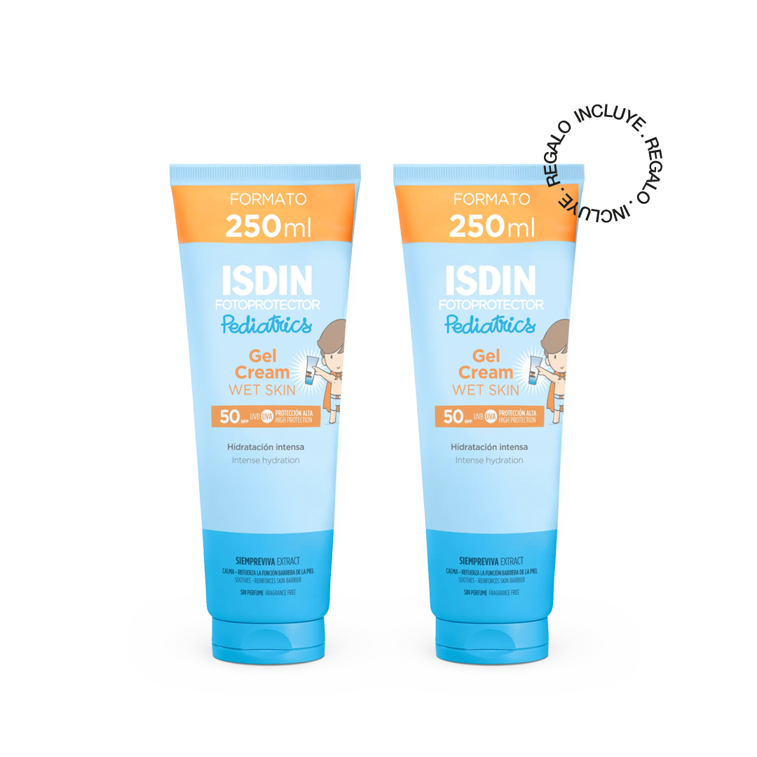 - 2 Gel crema Wet skin 250ml: Protege la piel del niño con Gel Cream Pediatrics SPF 50, el fotoprotector que hidrata como una crema y refresca como un gel. Con Wet Skin, facilita la aplicación en piel húmeda sin dejar residuo blanco.
